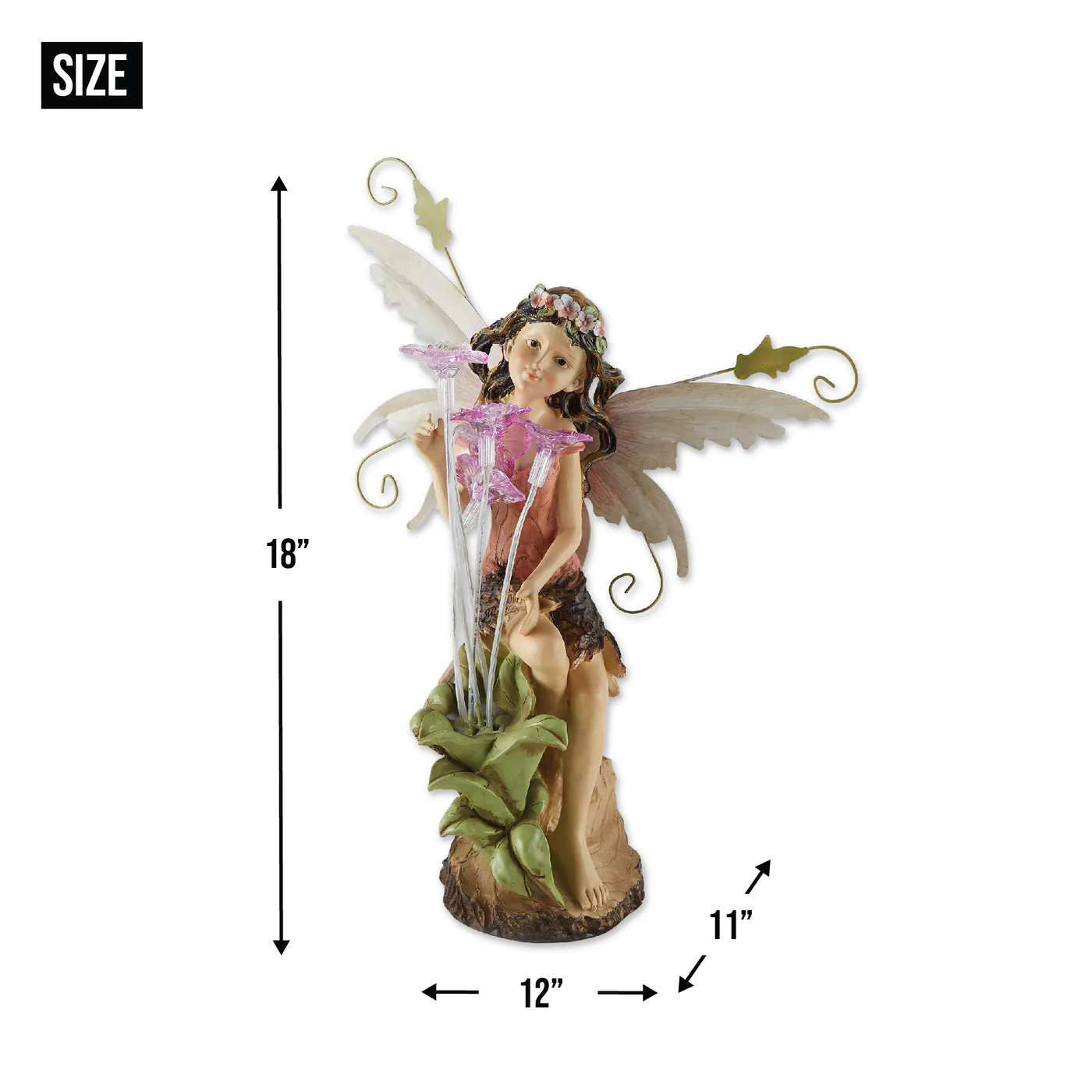 • A sweet young fairy pauses to admire a new-found patch of blushing blooms, blessing your garden with the beauty of spring. Enjoy this statue both day and night, thanks to tiny solar lights nestled inside each lovely flower!