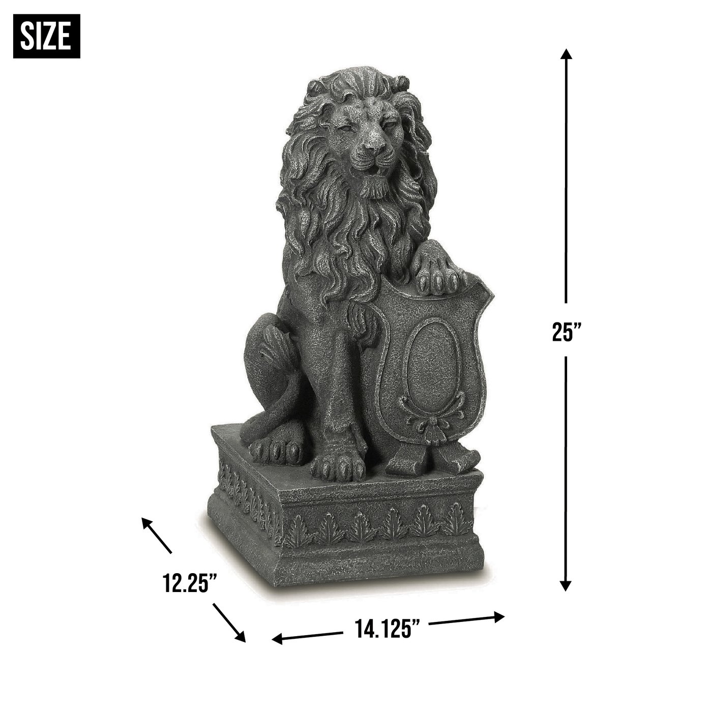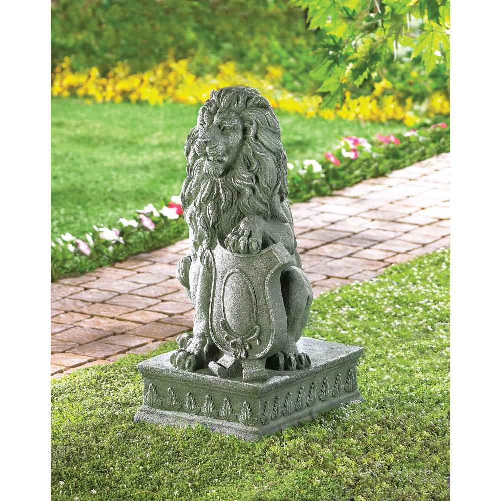 • With his mighty paw placed atop a crested shield, a regal lion surveys all who approach the door to your “castle.” Inspired by the centuries-old stone carvings found in castles and cathedrals throughout Europe, this impressive statue makes a bold historical statement and lends distinction to your entryway or garden!