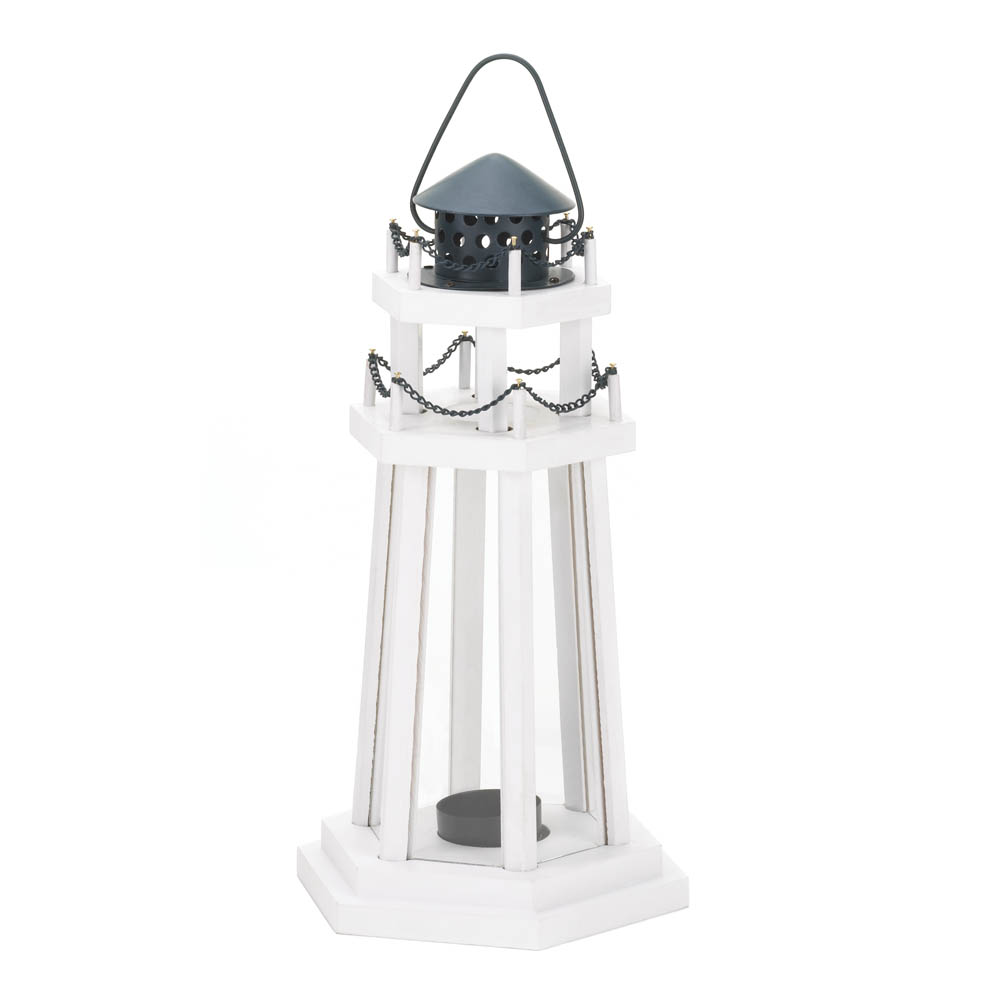 Decorate your home like a sleepy seaside village with this charming lighthouse lantern. With glass window panes, chain details, and a metal handle for easy hanging this lantern is both sturdy and chic. Place a candle or LED of your choice inside the lantern to illuminate your space in a soft and serene glow. Use it to create a centerpiece for parties or special events, display on a countertop or coffee table, or to accent beach themed décor - available in a variety of styles and colors!