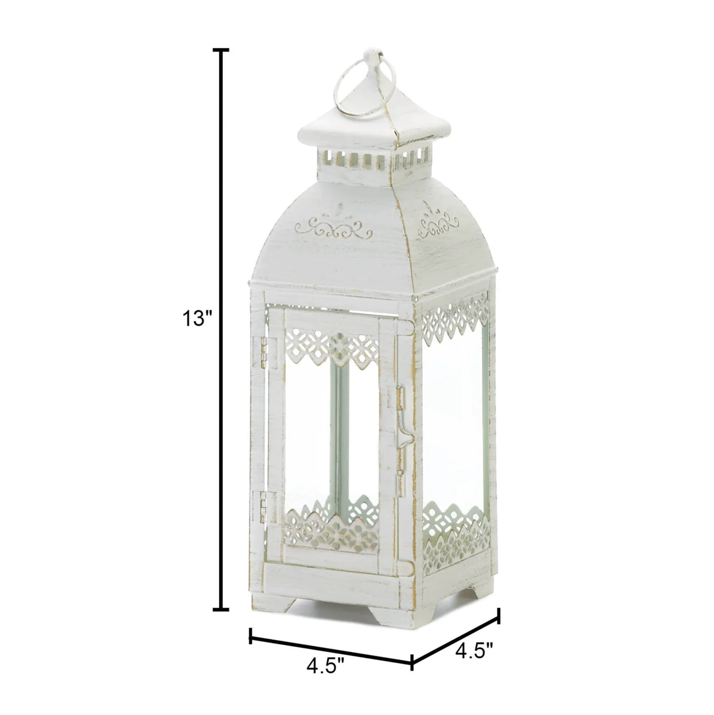 • The decorative lantern features an iron frame in an antique-white finish with gorgeous white lace detailing. Perfect for farmhouse chic or French country decors, place your choice of candle or LED lighting inside the lantern with the easy to open front glass panels. Whether placed or hung, this lantern will illuminate your space in a stylish glow.