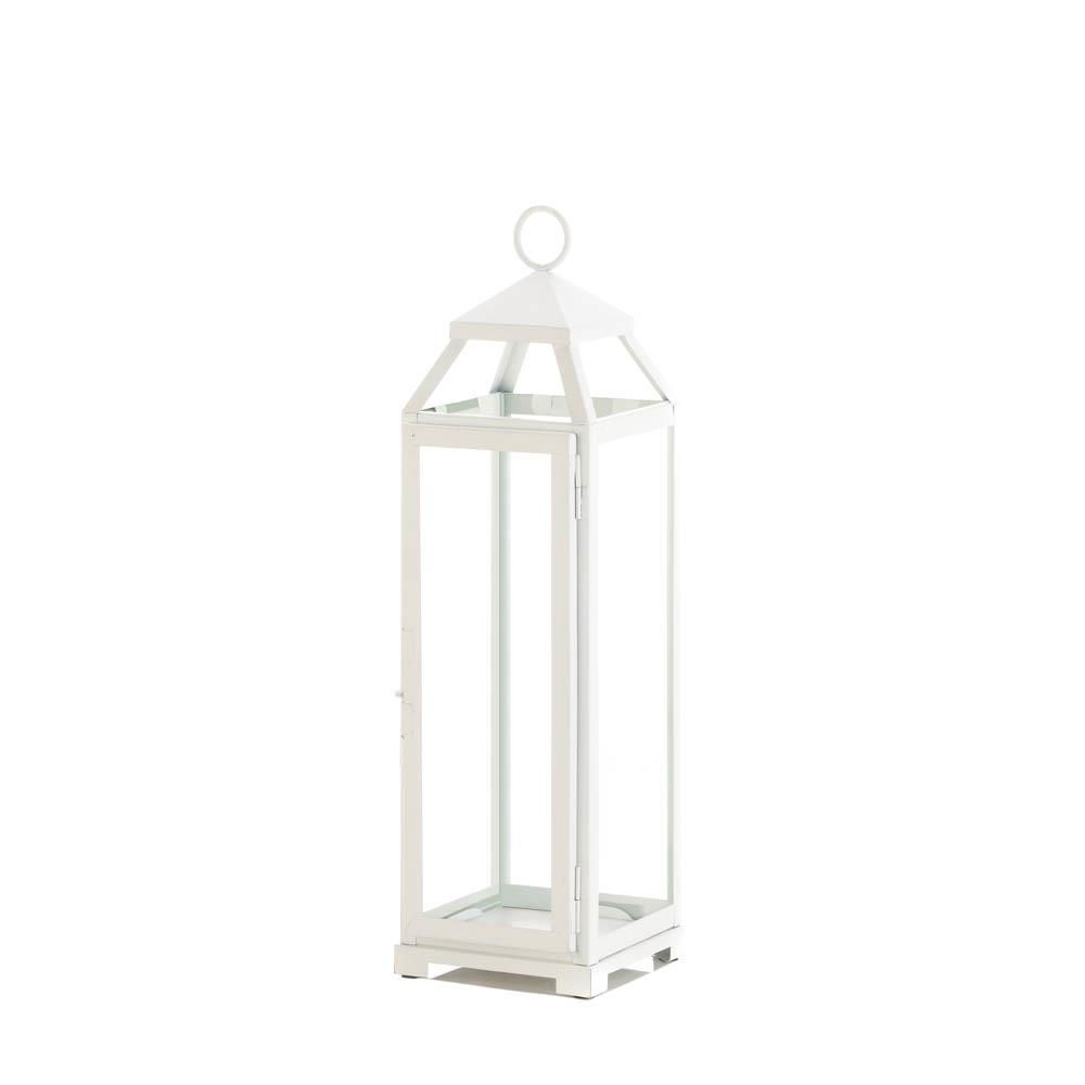 Bring a cool and calming accent to your lighting decor with the charm of this large country white candle lantern. This lighting solution will channel elegance into your home, creating an ambiance that makes a fine addition to the office, bedroom or patio. Add a candle of your choice and hang in the patio or find your favorite spot indoors. Candle not included. Weight 3.4 pounds. 5.5" x 5.75" x 19". Iron, Glass. UPC Number: 849179038007.
