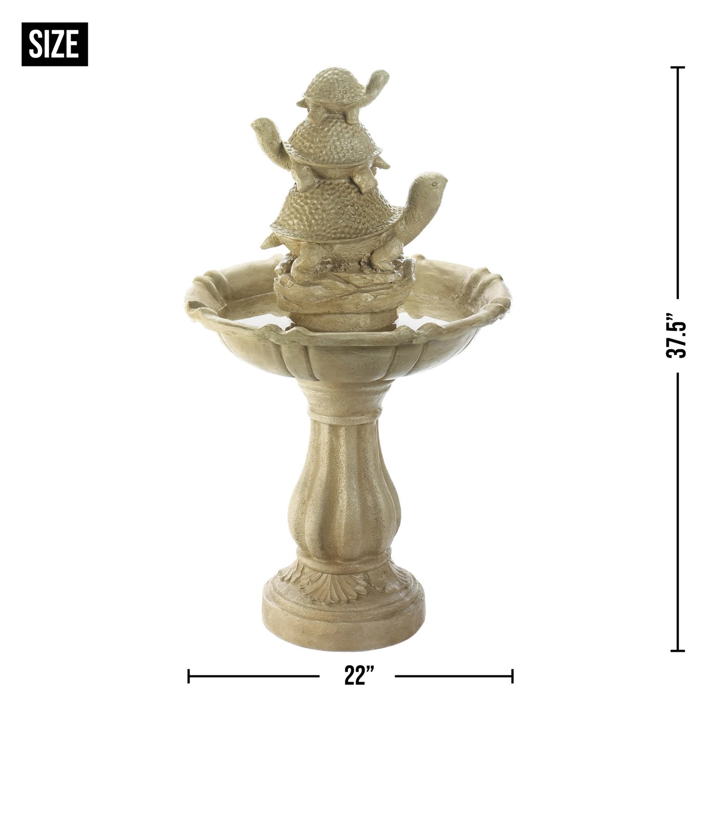 • Ivory color fountain weighs 25.6 lbs. and measures 22x22x37.5 inches.
