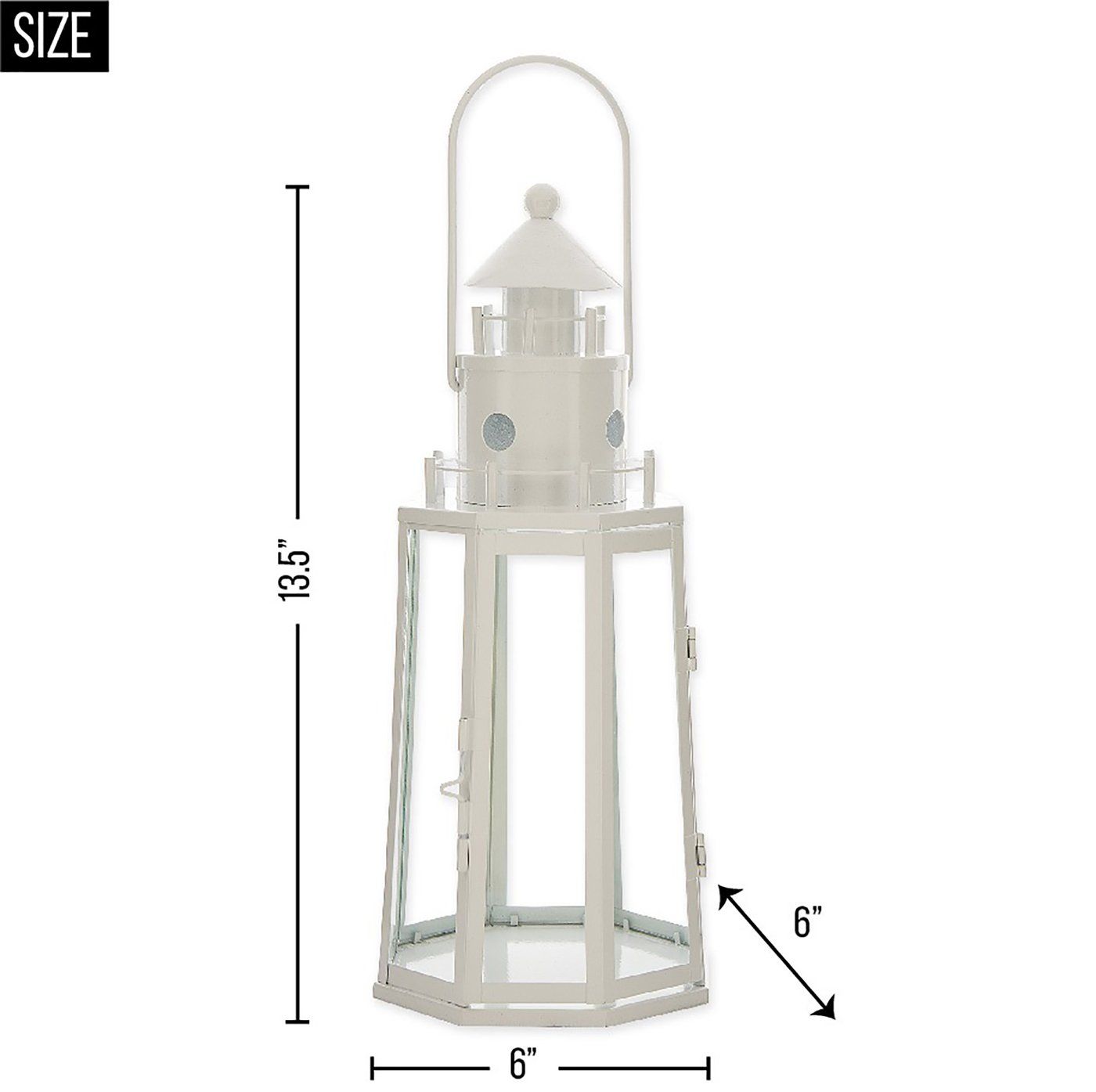 • This Lighthouse inspired lantern weighs 2.2 lbs. and measures 6 inches by 6 inches by 13.5 inches.