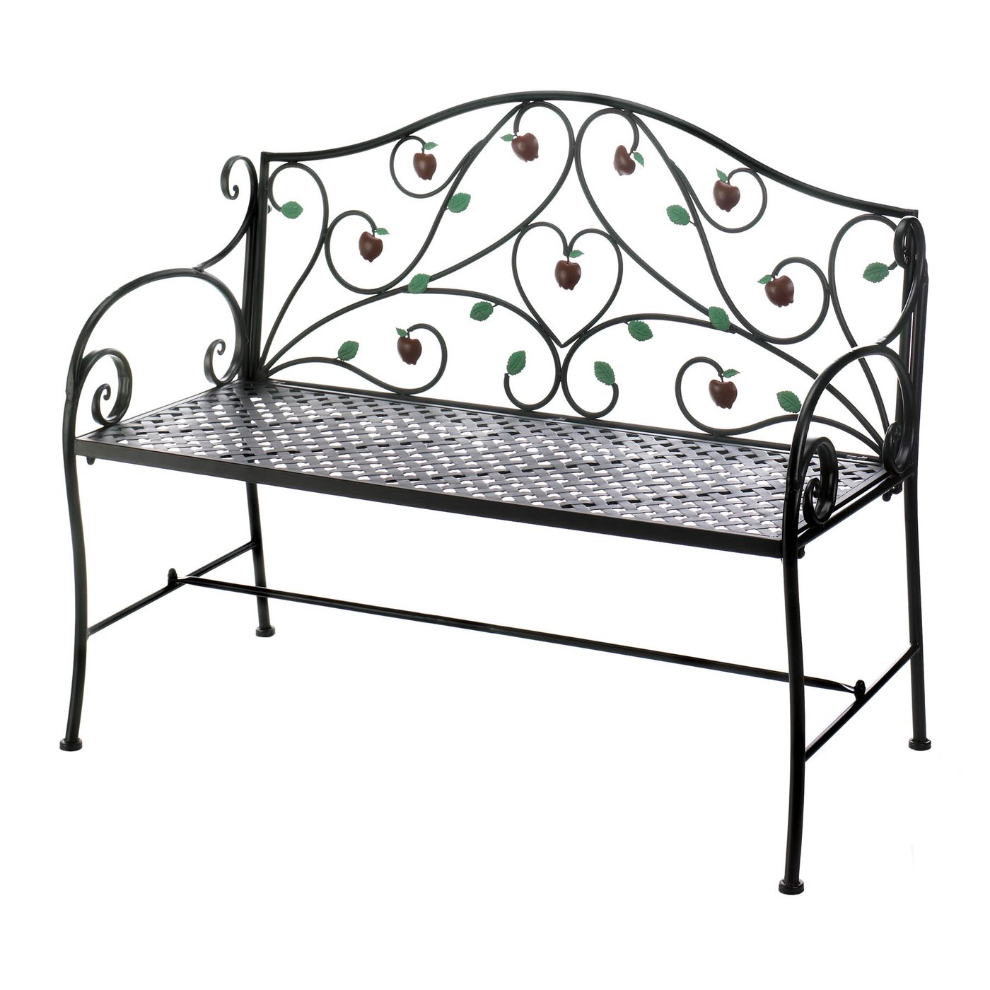 • Enjoy this decorative iron bench detailed with hanging apples. Place in a shady spot under a tree or along a garden path for a place to relax and enjoy nature. Sit side by side with a friend, sipping tea on a beautiful summer day. This bench is perfect if your outdoor entertaining space requires additional seating, place on a deck or patio and add cushions if needed.