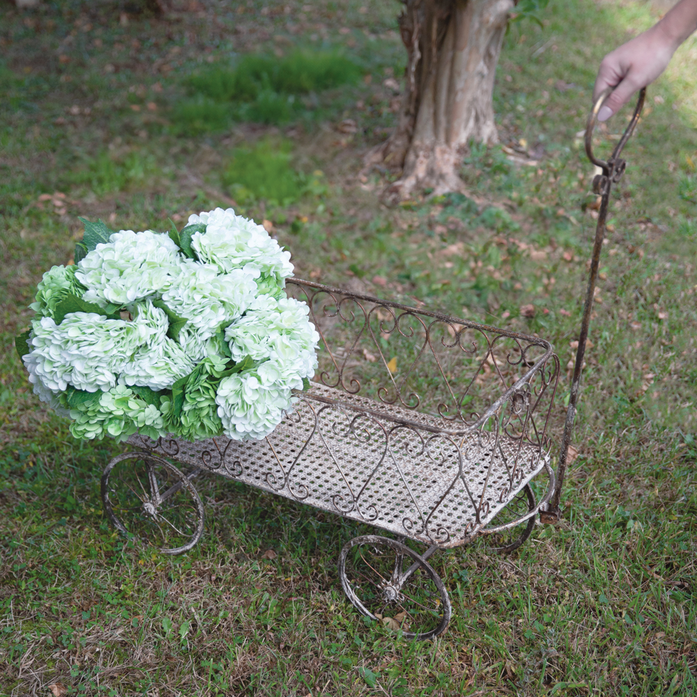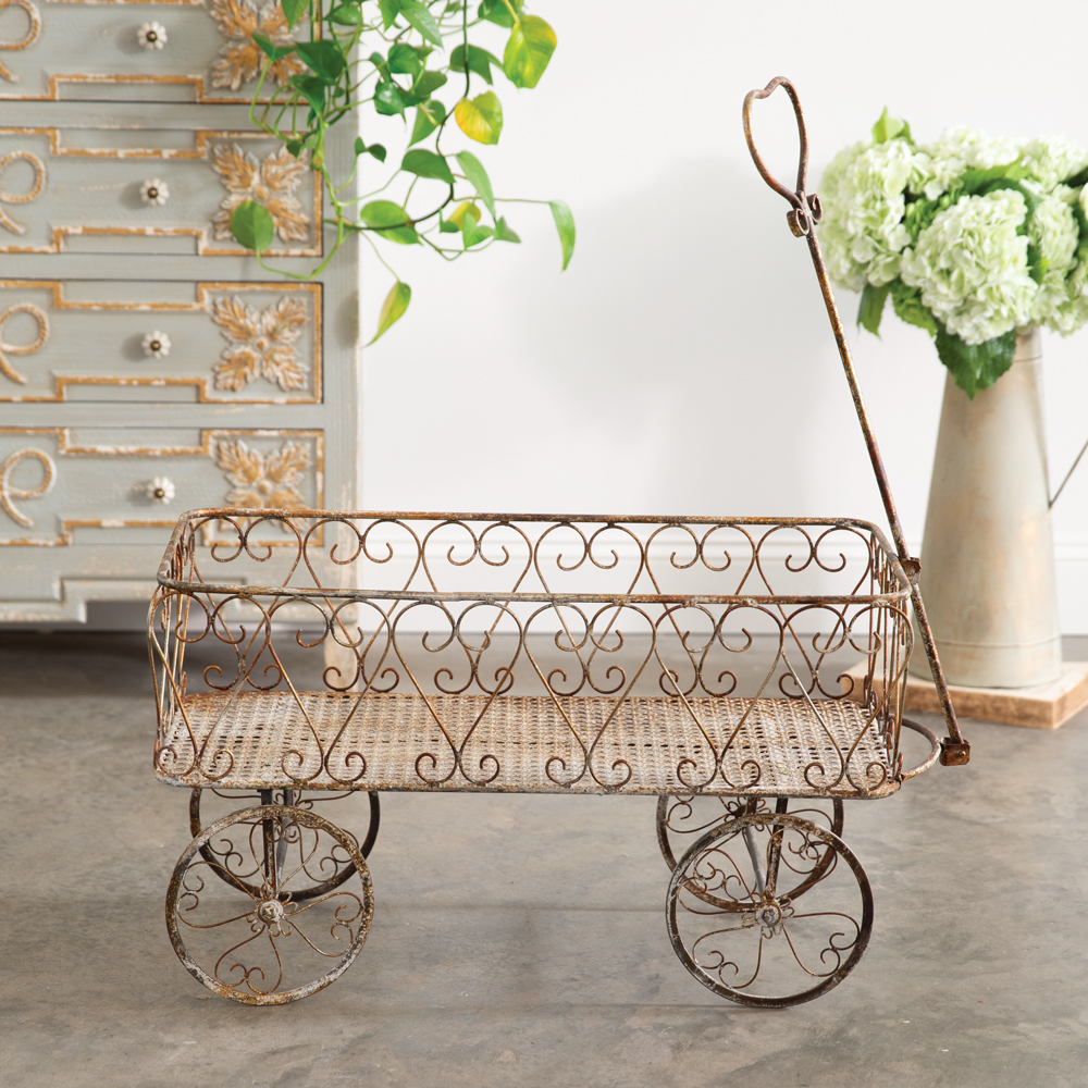 Our French Wagon welcomes memories of idyllic countryside scenes and timeless adventures. It is an endearing display in a garden or home that radiates rustic elegance. Use this display to place planted pots in a garden or blankets in a home. This wagon is crafted from metal rolls.