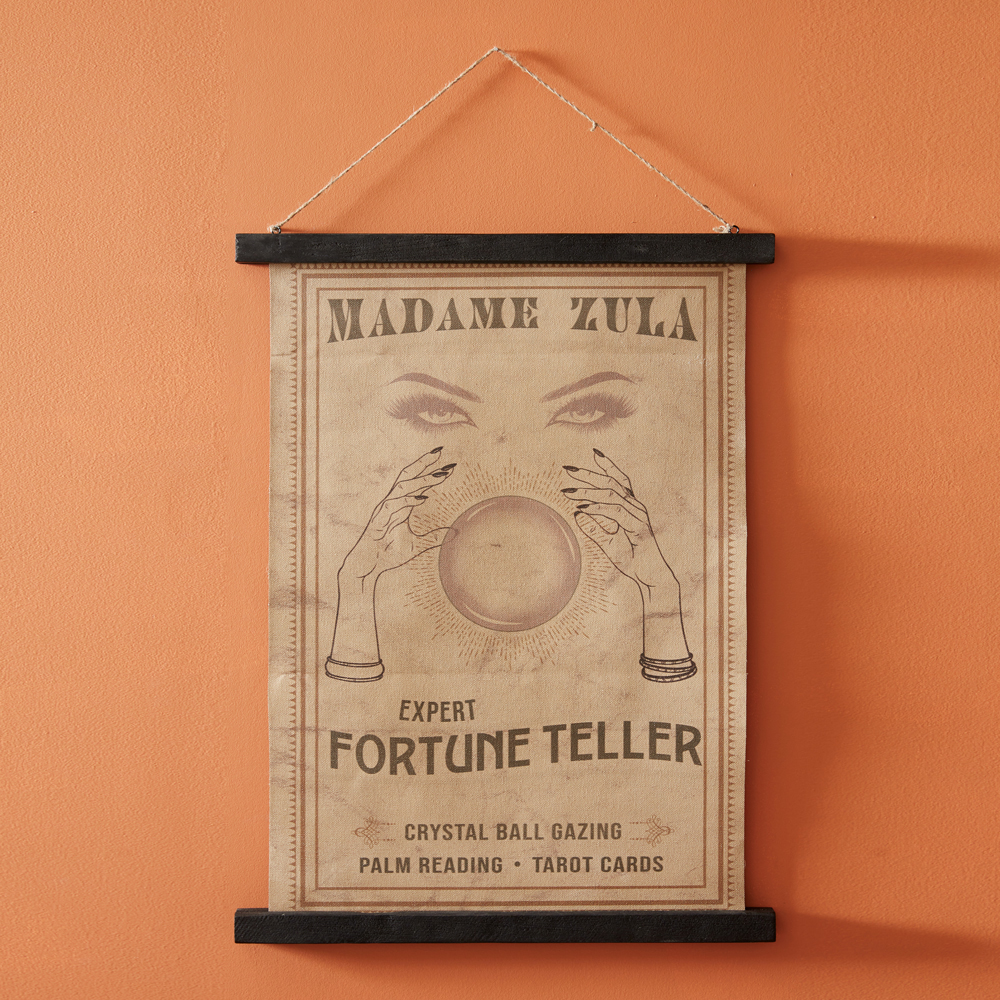 Crystal ball gazing, palm reading, and tarot cards too! Madame Zula can tell every part of your fortune or foes. This wall sign is a perfect display for Halloween decor.